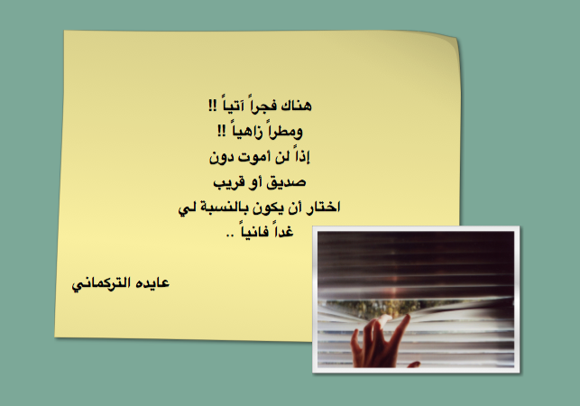 غداً فانياً .، Published 19 ديسمبر 2012 | By admin حجم الخط » تكبير | تصغير Related posts:قيمة أرستقراطية .،أُفقـــي .,أخبرتني الطيور .,