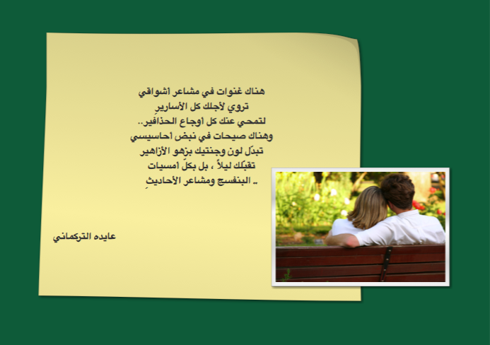 رحيق اكتمالنا.، نشر 8 نوفمبر 2012 | بواسطة admin لم يعد ذلك القلب الرضيع يكفينا يا سيّد العروق الرقيقة ، الجديرة ولا حتى ابتهال اللحظات الخيالية عادت تبني معنا قصورنا الوردية فقد كبرنا وسط نوافذ أحلامنا وبتنا أجهر بالوضوحات الذهبية ، النادرة المصداقية .. وقطعنا عقود اللآلئ الاعتيادية وسِرنا مع همسات الشموع الليلية والأنفاس العميقة ، الشاعرية .. فلم نعد كأيّ العشاق البالغين ، الراشدين .. بل طمرنا عقول المتعلمين والمثقفين وتخطّينا آلمراحل الأجمل من اعتقادات الفوانيس السحرية ، الخزعبلية.. وسيناريوهات الإرتباطات السقيمة ، الانتهازية .. وأرغمنا مساحات الهوى على الخضوع لدعواتنا السرية ، الوجدانية.. وعلى الإكمال في مسيرة الوثوق بالإجتهادات القدرية .. لذا مازالت أرواح عمقنا وقلوب انتمائنا متشبثة بطرق النجاة في مدائن غرامنا التي ستلد بعد يقين إيماننا ابتغائات رجائنا ..وجزيرة هيامنا ونسجل استمرارنا ..في غرابة أيامنا ونتوّج استثنائيتنا بزفاف .. يزهر بداياتنا ويلوّن أشعار جنوننا.. حينها سَـ يوثّق وفاء ارتباطنا ويُنثر رحيق اكتمالنا بعد معانات وصولنا..